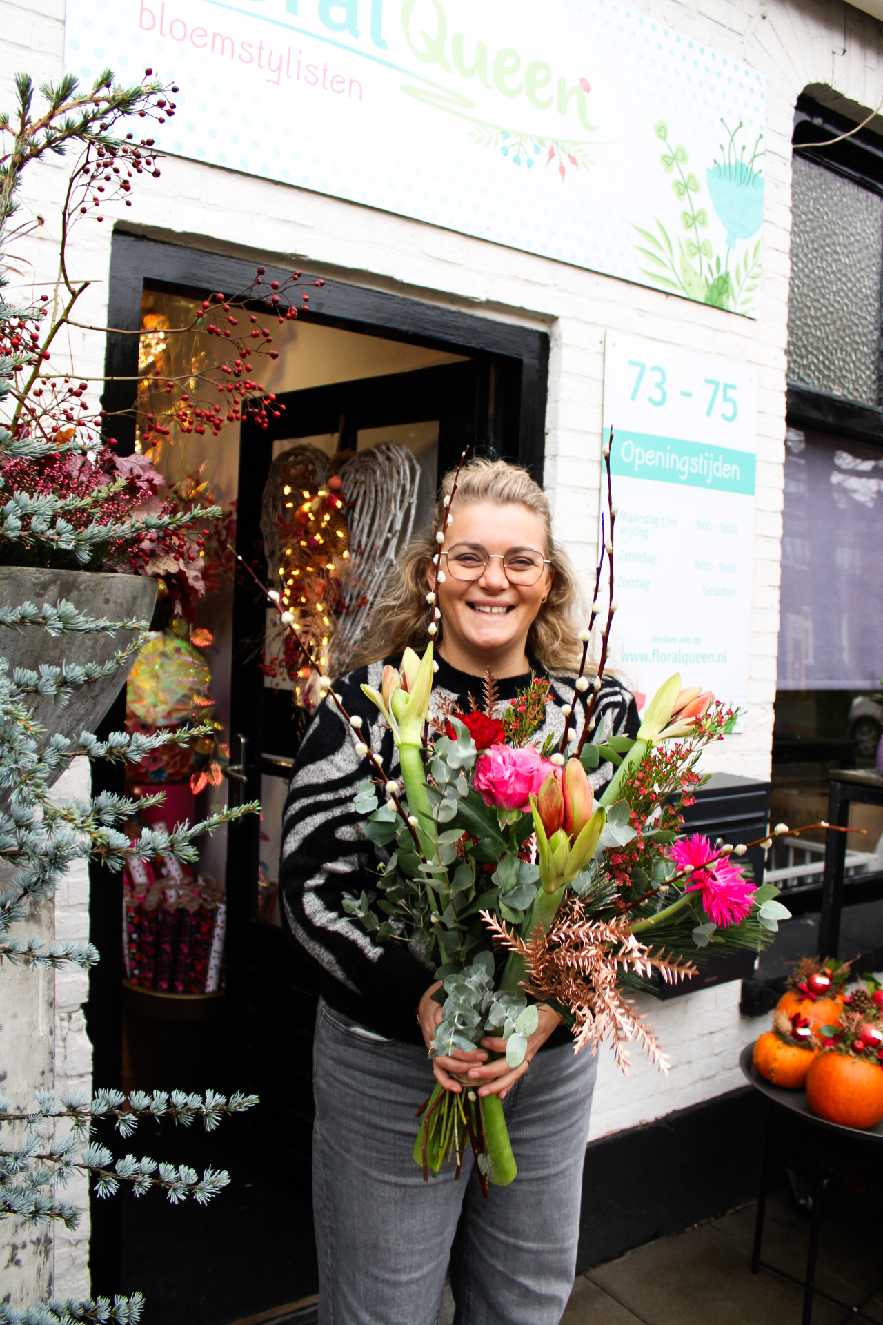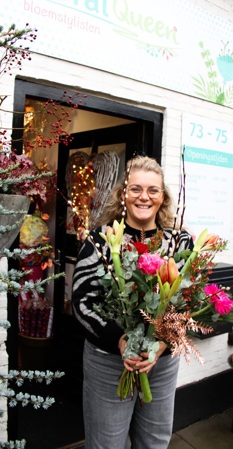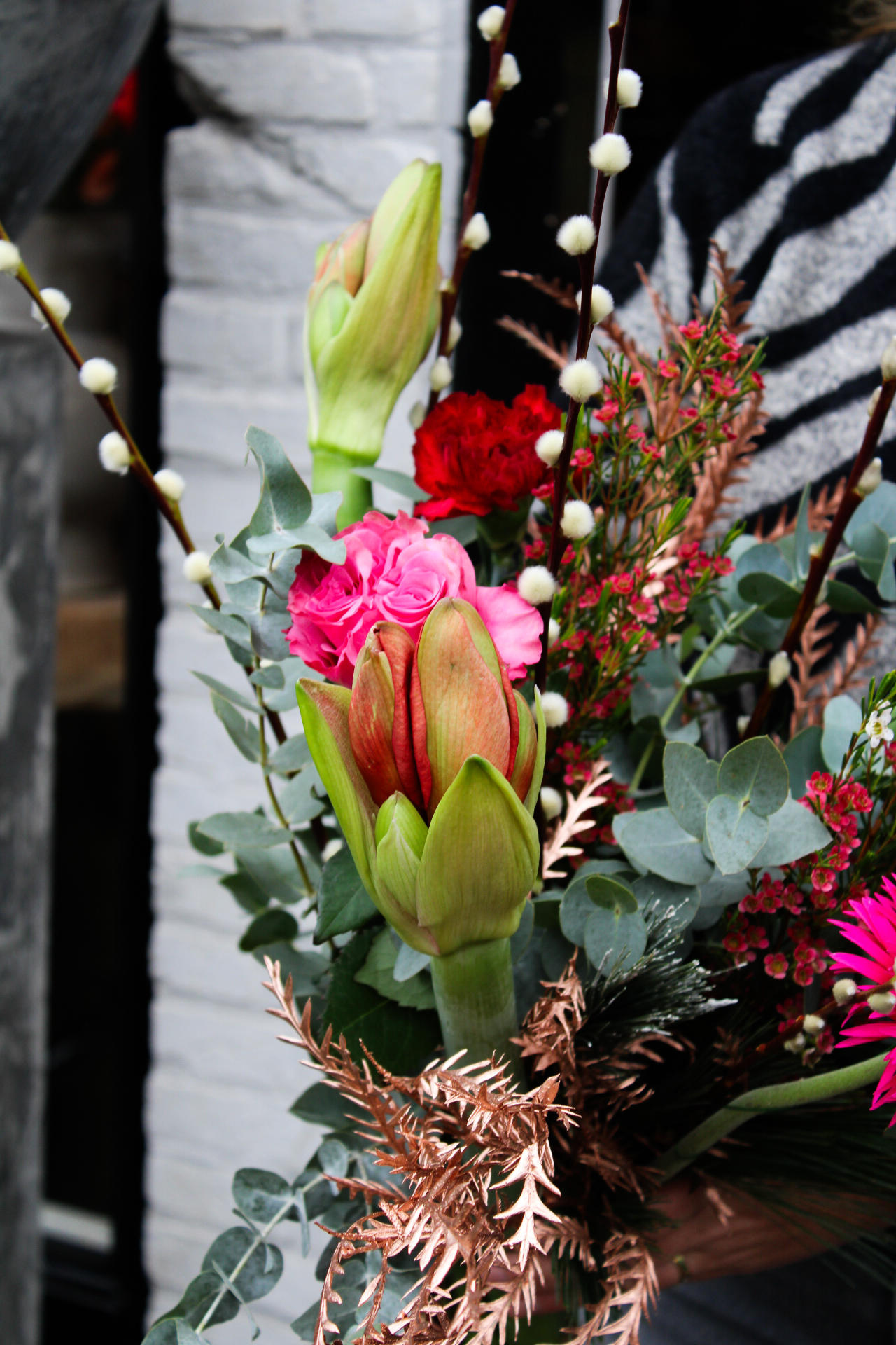 Xmas Glow! Een super leuk boeket met oa amaryllis, rozen, geurende eucalyptus en katjestakken.