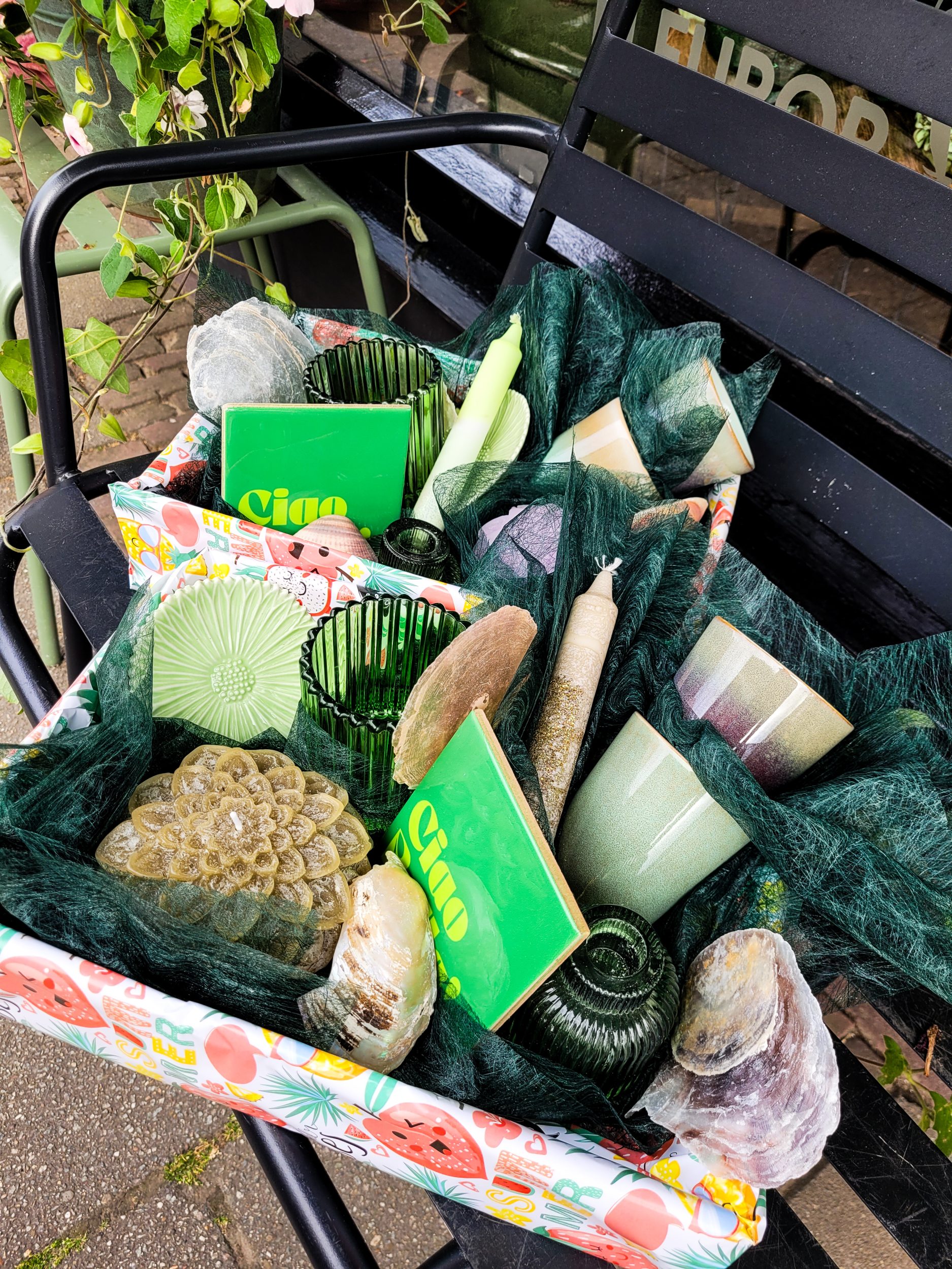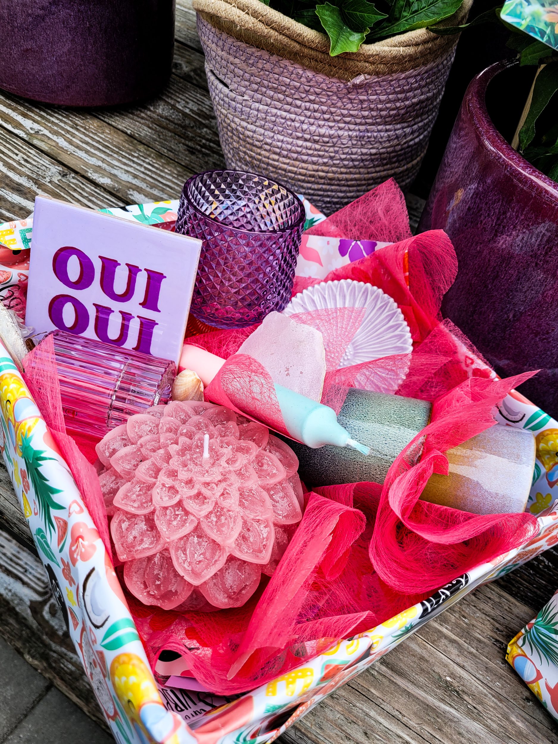 In de box zitten allemaal leuke items zoals; gezellige kopjes, waxine licht, dahlia kaars, tegeltje en meer leuks! Dit wil je toch? De box is helemaal leuk ingepakt, dus echt een feestje om te geven en te krijgen. De box kost €50,- en we hebben verschillende kleurkeuzes: oranje/roze, paars/roze, groen/naturel