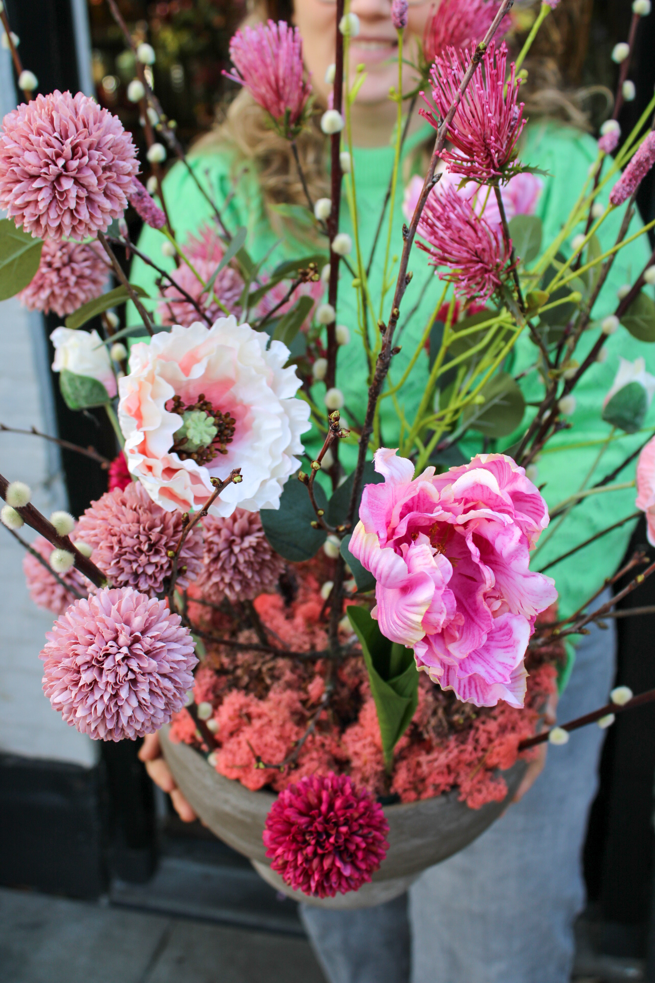 Een prachtige zijdebloemstuk in prachtige roze voorjaarstinten. Opgemaakt op een mooie neutrale pot. Deze combinatie staat prachtig op een bedrijf of op een kookeiland